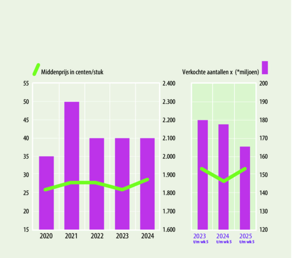 Trosroos l Verkochte aantallen en middenprijs van trosroos in 2020 t/m 2024 en in de eerste 5 weken van 2023 t/m 2025.